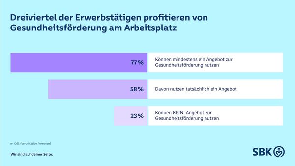 77 Prozent der Arbeitnehmerinnen und Arbeitnehmer können an ihrem Arbeitsplatz gesundheitsfördernde Angebote nutzen. Das ist das Ergebnis einer Befragung unter 1.055 Beschäftigten des Instituts YouGov im Auftrag der SBK Siemens-Betriebskrankenkasse.