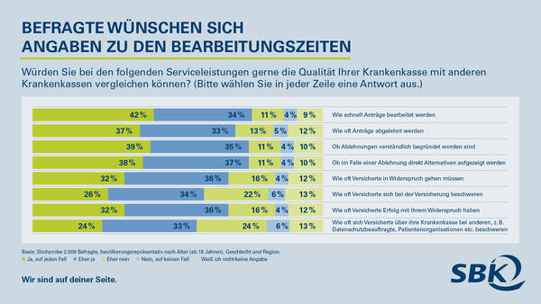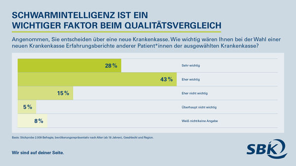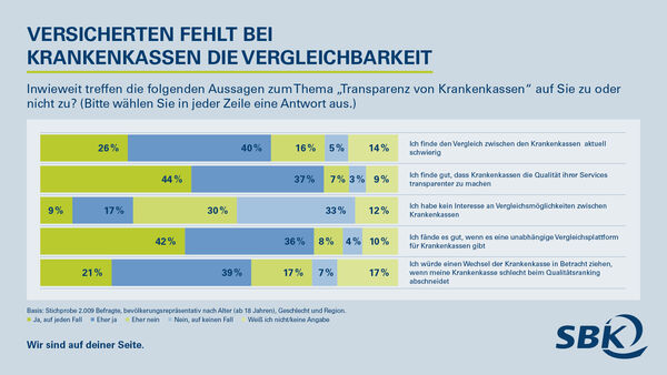 Aktuell fehlen einheitliche und gut vergleichbare Qualitätskriterien für Krankenkassen, zum Beispiel zu deren Genehmigungs- und Ablehnungsquoten, den Widerspruchs- und Klagequoten oder der Bearbeitungsdauer von Anträgen. Auch das Urteil der Versicherten wird nicht systematisch erfasst und veröffentlicht. Deshalb hat die SBK Siemens-Betriebskrankenkasse 2.009 Menschen ab 18 Jahren nach ihren Erwartungen gefragt: Was braucht es, damit Versicherte die Qualität einer Kasse gut einschätzen können? Laut den Ergebnissen der YouGov-Umfrage wünschen sich viele Deutsche, dass der Qualitätsvergleich von Krankenkassen vereinfacht wird. Immerhin 60 Prozent der Bundesbürgerinnen und -bürger würden ihren Anbieter wechseln, falls dieser bei einem Vergleich schlecht abschneidet. Nur knapp ein Viertel der Befragten ließe sich von zusätzlichen Informationen über die Services nicht beeinflussen. Sie blieben ihrer Krankenkasse ohnehin treu.