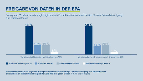 Menschen, die häufiger beim Arzt sind, sind dabei deutlich aufgeschlossener als Gesunde. Rund drei Viertel der chronisch beziehungsweise langfristig Erkrankten (74 Prozent) und älteren Menschen ab 55 Jahren (72 Prozent) sind der Auffassung, dass der Schutz von gesundheitsbezogenen Daten so gestaltet sein muss, dass ein digitaler Austausch von Daten zwischen Ärzt*innen und weiteren Akteur*innen des Gesundheitswesens unkompliziert möglich ist. Bei den Gesunden sind es nur 66 Prozent. Diese Offenheit den digitalen Möglichkeiten gegenüber bestätigt sich auch bei anderen Fragestellungen. So wünschen sich 56 Prozent der Älteren und der chronisch beziehungsweise langfristig Erkrankten, eine Generaleinwilligung für den Datenaustausch geben zu können.