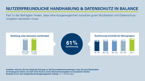 Und auch die Ausgewogenheit zwischen Nutzerfreundlichkeit der digitalen Anwendungen und Datenschutz ist in diesen Gruppen für eine Mehrheit von großer Bedeutung: Dies gaben Ältere zu 69 Prozent und Erkrankte zu 68 Prozent an.