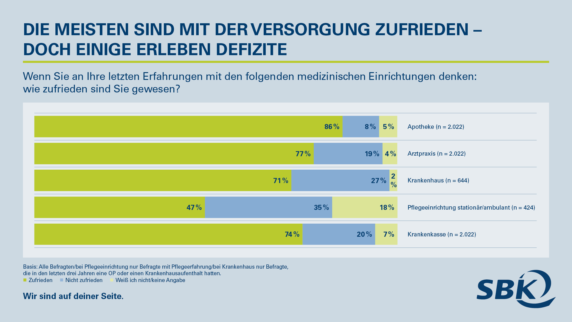 Umfrage: Die meisten Menschen sind mit der medizinischen Versorgung zufrieden. Doch ein nicht unerheblicher Teil erlebt Defizite (04.12.2023)