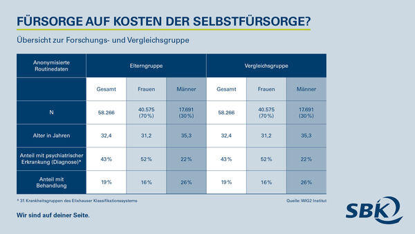 Mütter von Säuglingen und Kleinkindern, die aufgrund einer Depression in Therapie sind, führen ihre Behandlung nach der Entbindung signifikant seltener fort als Frauen in einer Vergleichsgruppe ohne Kleinkind. Auch haben die Neu-Mütter weniger Kontakte mit psychologischen oder psychiatrischen Fachärzt*innen. Zu diesem Ergebnis kommt eine umfassende Auswertung des WIG2 Instituts von 116.532 anonymisierten Datensätzen von Versicherten. 58.266 Datensätze von Eltern, die in den letzten vier Jahren ein Kind bekommen haben (im Folgenden Gruppe der „Eltern“, „Mütter“ oder „Väter“ genannt), wurden einer ebenso großen Vergleichsgruppe von Versicherten, die in den letzten Jahren kein Kind bekommen haben (im Folgenden Gruppe der „Nicht-Eltern“, „Nicht-Mütter“ oder „Nicht-Väter“ genannt) gegenübergestellt. Auftraggeber der Studie ist die SBK Siemens-Betriebskrankenkasse.