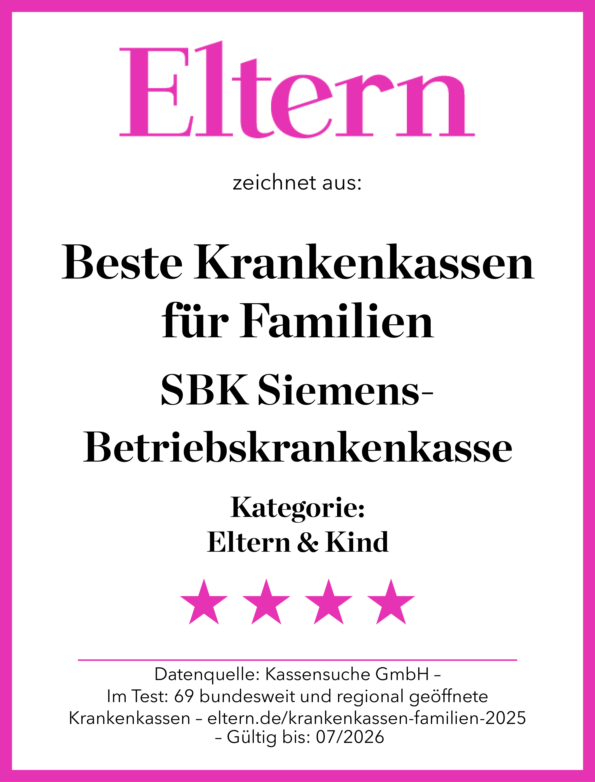 Die Zeitschrift Eltern hat der SBK ausgezeichnete Leistungen in der Kategorie "Eltern & Kind" bestätigt. Entdecken Sie die Vorteile.