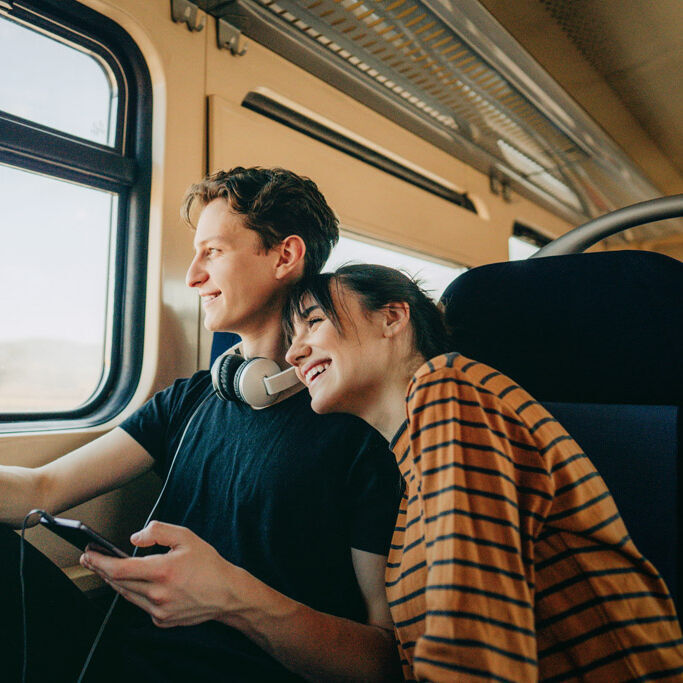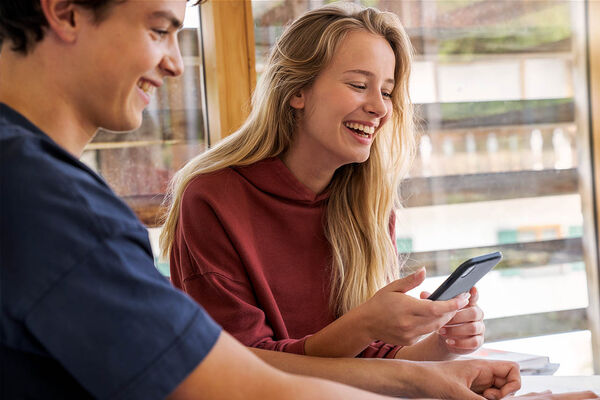 Zwei junge Erwachsene sitzen zusammen auf einer Terrasse und lachen gemeinsam.