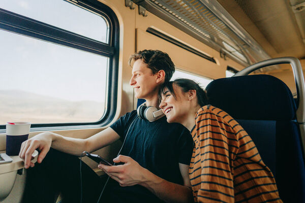 • ein junges Paar sitzt gemeinsam im Zug und sie schauen fröhlich aus dem Fenster.