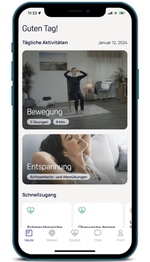 Zunächst erstellen Sie Ihr individuelles Schmerzprofil. Auf dieser Basis werden die Übungen und Inhalte mithilfe von Künstlicher Intelligenz (KI) speziell für Sie ausgewählt und angepasst. Die Übungen sind so konzipiert, dass 15 Minuten am Tag ausreichend sind. Wenn Sie Fragen haben, können Sie mit einer Physiotherapeutin oder einem Physiotherapeuten chatten.