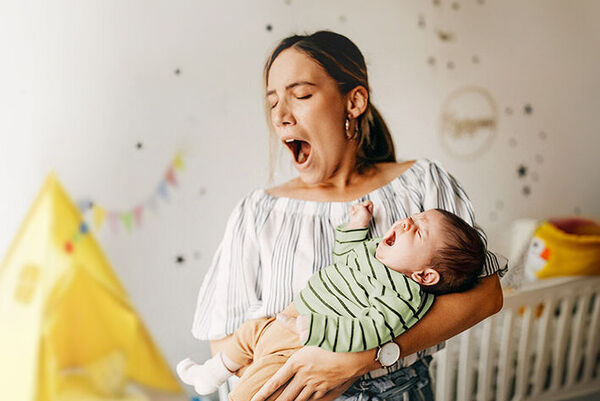 • Eine Mutter hat ihr Neugeborenes auf dem Arm und die beiden gähnen.