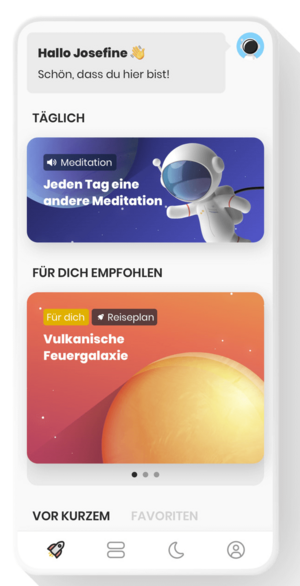 Mit einem kleinen Astronauten geht Ihr Kind auf Entdeckungsreise ins Weltall der Gefühle. Gemeinsam bereisen sie z. B. den Wutplaneten und entdecken dabei, wie sie mit Ungeduld, Angst, Trauer und Wut umgehen können. Sie lernen, sich selbst achtsam zu begegnen um besser mit ihren Gefühlen umgehen zu können. Und sie lernen, wie sie zur Ruhe kommen können, wenn sie einmal nicht einschlafen können.