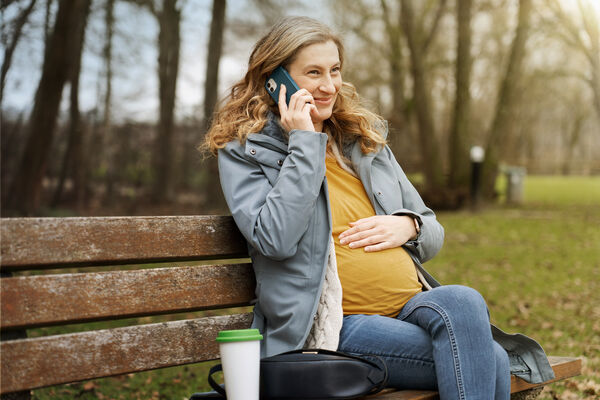 Schwangere Frau sitzt auf einer Parkbank und telefoniert.