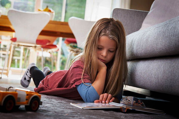 Ein Mädchen liegt auf dem Bauch auf dem Boden im Wohnzimmer und liest ein Buch.