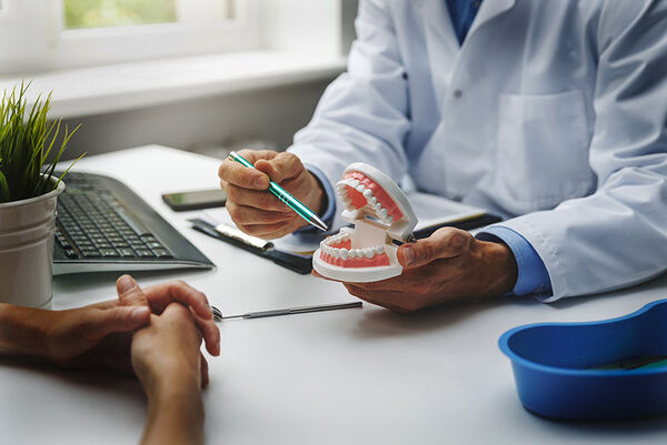 Ein Zahnarzt klärt seinen Patienten anhand eines Gebiss-Modells auf.