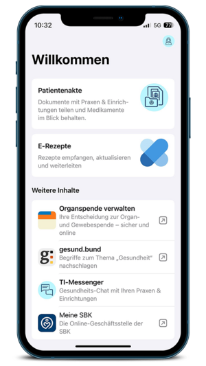 Die elektronische Patientenakte (ePA) speichert alle Ihre wichtigen Gesundheitsdaten sicher und digital. So haben Sie alle Informationen zu Ihrer Gesundheit wie Arztbriefe, Medikationspläne oder Befunde immer dabei. Bei uns geht das in der SBK Patientenakte-App mit E-Rezept-Funktion. Zusätzlich können Sie Ihre Daten z.B. mit Arztpraxen, Apotheken oder Krankenhäusern teilen. Wer Ihre Daten sehen darf, bestimmen Sie selbst.