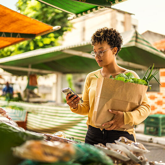 Eine Frau steht an einem Marktstand, hält Gemüse im Arm und schaut auf ihr Smartphone.