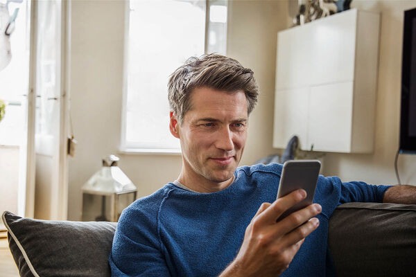 Ein Mann sitzt im Wohnzimmer auf dem Sofa und schaut in sein Handy.