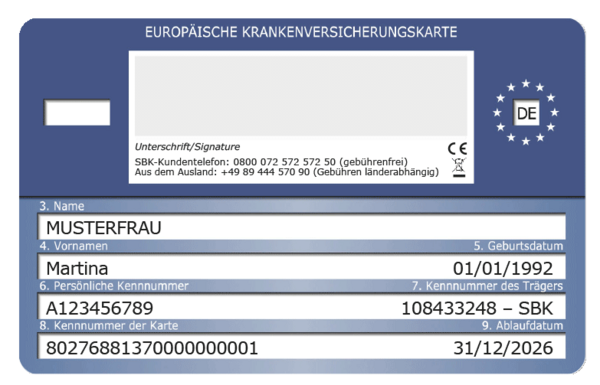 The back of the SBK healthcare card features the European Health Insurance Card (EHIC) for use abroad. This provides basic coverage in most European countries. For optimal coverage abroad, we recommend an