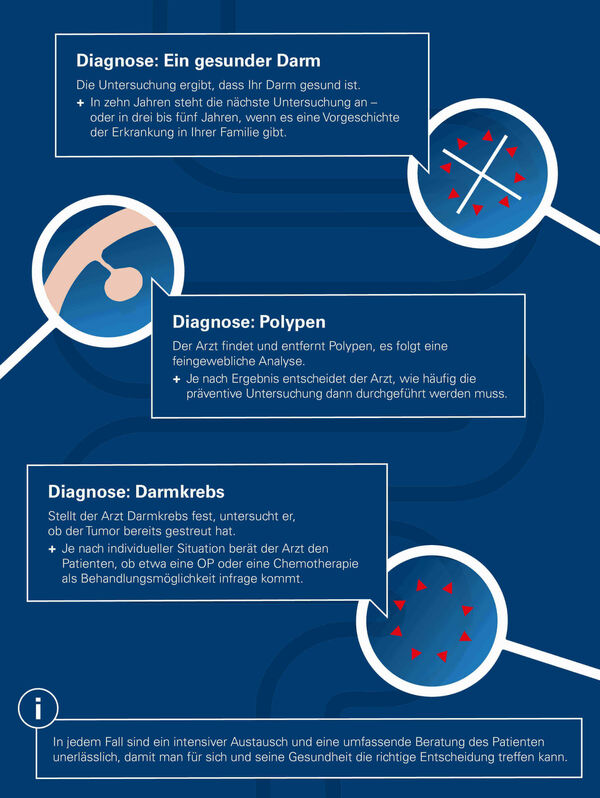 Wer sich für eine Darmspiegelung entscheidet, leistet einen wichtigen und guten Beitrag zur Früherkennung. Nach der Untersuchung gibt es drei mögliche Ergebnisse. Im Schaubild werden Ihnen diese möglichen Diagnosen anschaulich dargestellt.