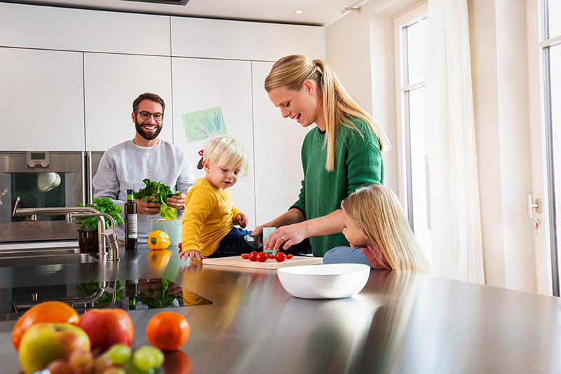 Warum binden Sie Ihre Kinder beim Kochen nicht einfach mit ein? Die Kleinen können zum Beispiel bei der Auswahl der Zutaten helfen oder Gemüse waschen. So bringen Sie das Kochen mit der Kinderbetreuung einfach unter einen Hut.