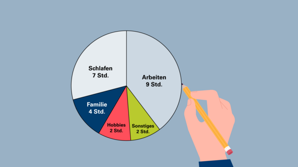 Zeichnen Sie einen Kreis auf ein Blatt Papier. Das ist Ihr „Zeitkuchen“, also die Zeit, die Ihnen täglich zur Verfügung steht. Jetzt zeichnen Sie „Kuchenstücke“ in unterschiedlicher Größe ein, also die Zeit, die Sie in unterschiedliche Lebensbereiche investieren. Das kann Zeit für Familie, Beruf, Freunde, Freizeit oder die Handynutzung sein. Dabei soll die Größe jedes Kuchenstücks in etwa dem Anteil an Zeit entsprechen, den Sie von Ihrer Gesamtzeit in diesen Lebensbereich investieren. Stellen Sie jetzt Fragen dazu, wie: