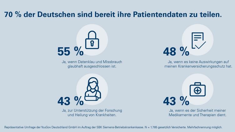 Laut einer repräsentativen YouGov-Umfrage im Auftrag der SBK ist es 68 Prozent der gesetzlich Krankenversicherten wichtig, dass ihre Patientendaten geschützt sind. 56 Prozent der Befragten möchten ihre Daten nur weitergeben, wenn Datenmissbrauch ausgeschlossen ist.