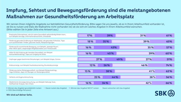 „Ein Großteil der Beschäftigten kann an der Arbeitsstelle etwas für ihre Gesundheit tun“, sagt Dr. Gertrud Demmler, Vorständin der SBK. „Das sind sehr gute Nachrichten für die Beschäftigten und den Standort Deutschland. Nicht zuletzt, weil der betrieblichen Gesundheitsförderung eine wichtige Rolle dabei zu kommt, die geringer werdende Anzahl an Fachkräften möglichst lange leistungsfähig zu halten.“