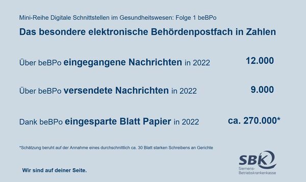 Was nach einem niedlichen Vornamen klingt, steht für besonderes elektronisches Behördenpostfach. Es ermöglicht die sichere digitale Kommunikation zwischen Behörden - im ersten Schritt mit den Gerichten. Dank beBPo werden Informationen zwischen diesen und der SBK deutlich schneller ausgetauscht als auf dem bis dahin üblichen Postweg. Entsprechend können Verfahren und Entscheidungen beschleunigt werden. Zudem trägt BePBo maßgeblich dazu bei, den Papierverbrauch zu reduzieren: Die Akten für ein durchschnittliches Gerichtsverfahren im Krankenkassenbereich füllen schon mal mehrere Leitz Ordner.