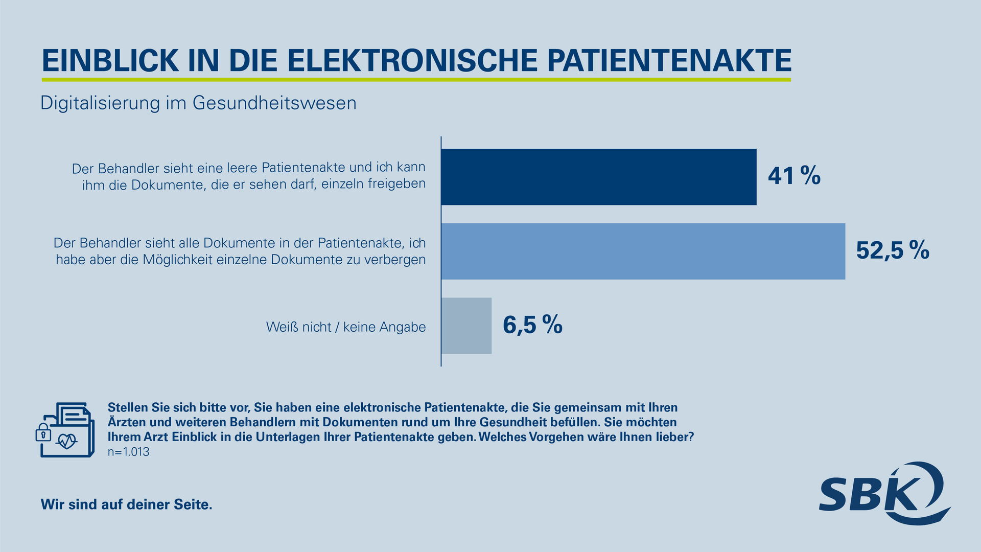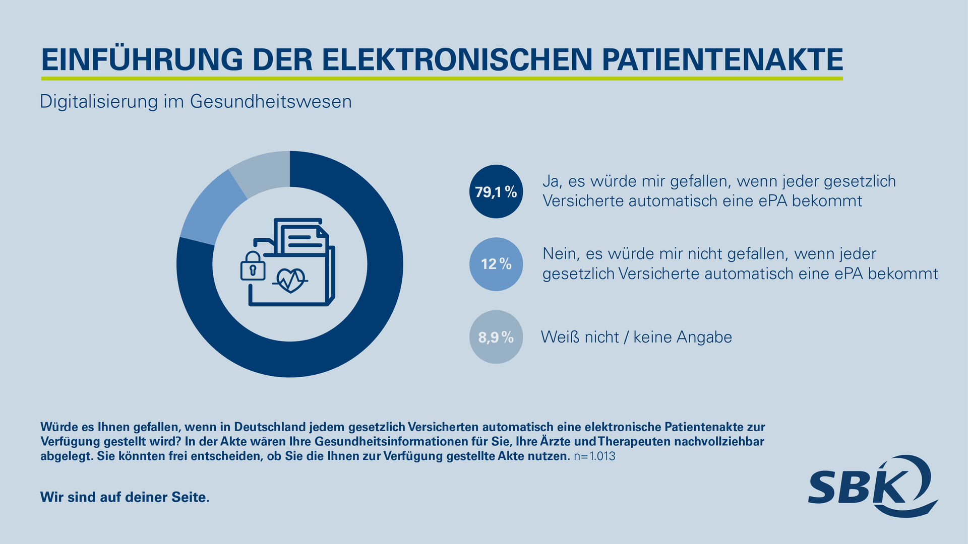 Eine konsequente Versichertenorientierung ist einer der Erfolgsfaktoren für eine gelungene Digitalisierung. Die Siemens-Betriebskrankenkasse SBK befragt deshalb immer wieder Versicherte, wie sie sich digitale Angebote und Services vorstellen. Das Institut Norstat hat in ihrem Auftrag dieses Mal zwei Fragen rund um die elektronische Patientenakte (ePA) gestellt.