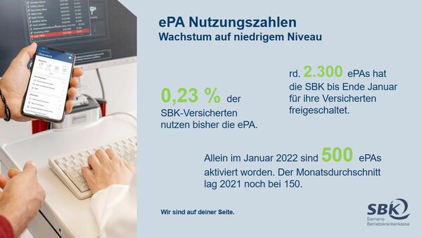 Das Interesse der Versicherten an der ePA ist weiterhin verhalten. Im ganzen Jahr 2021 haben wir bei der SBK etwas über 1.800 Akten freigeschaltet. Ende Januar 2022 ist diese Zahl auf rund 2.300 angewachsen. Das heißt: Wir reden bei über 1 Million SBK-Versicherten von nur 0,23 % ePA-Nutzer*innen. Stellt man aber den Monatsvergleich an, verzeichnen wir eine Steigerung von durchschnittlich 150 ePA-Freischaltungen pro Monat im Jahr 2021 auf immerhin 500 allein im Januar 2022.