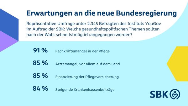 Welche Themen sollte der künftige Gesundheitsminister oder die künftige Gesundheitsministerin nach der Bundestagswahl am schnellsten angehen? Mit dieser Frage befasste sich kürzlich eine repräsentative Umfrage unter 2.345 Befragten des Instituts YouGov im Auftrag der SBK Siemens-Betriebskrankenkasse. Über 80 Prozent der Umfrageteilnehmer sind sich einig: Die ärztliche Versorgung steht in ihren Augen weit oben auf der Liste.