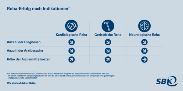 Die SBK Siemens-Betriebskrankenkasse hat im Rahmen des Health Insurance Hack 2020 pseudonymisierte Daten aus ihrem Versichertenbestand analysieren lassen.1 Erste Anzeichen weisen darauf hin, dass sich der Erfolg einer Rehabilitationsmaßnahme je nach Indikation stark unterscheidet. Kardiologische, geriatrische und neurologische Rehas scheinen besonders erfolgsversprechend zu sein.