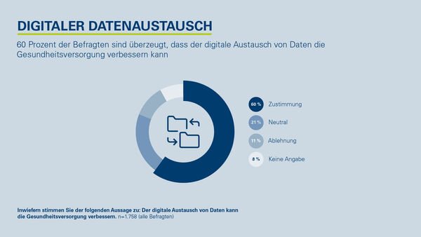 Menschen, die häufiger beim Arzt sind, sind dabei deutlich aufgeschlossener als Gesunde. Rund drei Viertel der chronisch beziehungsweise langfristig Erkrankten (74 Prozent) und älteren Menschen ab 55 Jahren (72 Prozent) sind der Auffassung, dass der Schutz von gesundheitsbezogenen Daten so gestaltet sein muss, dass ein digitaler Austausch von Daten zwischen Ärzt*innen und weiteren Akteur*innen des Gesundheitswesens unkompliziert möglich ist. Bei den Gesunden sind es nur 66 Prozent. Diese Offenheit den digitalen Möglichkeiten gegenüber bestätigt sich auch bei anderen Fragestellungen. So wünschen sich 56 Prozent der Älteren und der chronisch beziehungsweise langfristig Erkrankten, eine Generaleinwilligung für den Datenaustausch geben zu können.