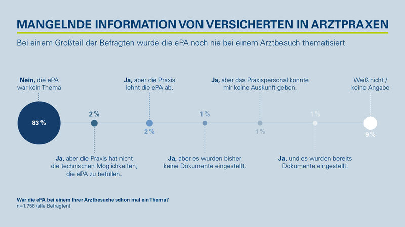 Dass das noch nicht der Fall ist, bestätigen auch die Ergebnisse der Umfrage. So wurde am Beispiel der elektronischen Patientenakte abgefragt, welchen Raum die Digitalisierung bei den letzten Arztbesuchen einnahm: 83 Prozent der Befragten gaben an, dass die ePA dort bisher kein Thema war. Bei je 2 Prozent der Befragten wurde die ePA bei einem Praxisbesuch zwar thematisiert, aber die Praxis hat nicht die technische Möglichkeit oder hat sogar von der Nutzung abgeraten. Nur 1 Prozent der Befragten hat angegeben, dass ihre Ärztin oder ihr Arzt bereits mit der ePA arbeitet.