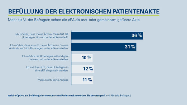 Dabei sehen die Patient*innen die Ärztinnen und Ärzte als einen wichtigen Partner in Sachen ePA: Auch wenn die ePA in Deutschland als patientengeführte Akte konzipiert ist, möchte etwas mehr als ein Drittel der Befragten (36 Prozent), dass nur ihre behandelnden Ärztinnen und Ärzte Unterlagen einstellen. Etwas weniger als ein Drittel (31 Prozent) möchte, dass sie selbst und Ärztinnen und Ärzte Unterlagen einstellen können. Nur 10 Prozent der Befragten möchten Unterlagen selbst digitalisieren.