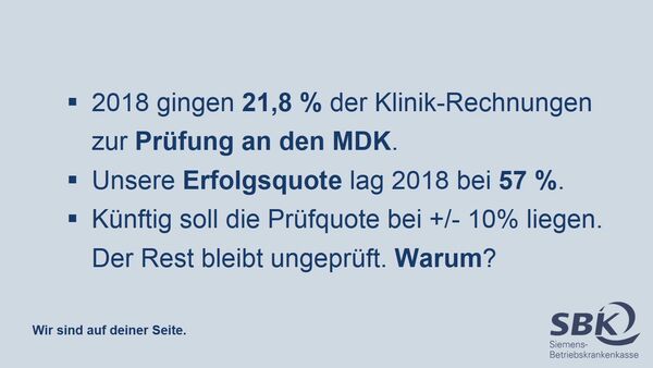 Derzeit geben wir 20 bis 25 Prozent der Rechnungen zur Prüfung an den MDK. Unsere Erfolgsquote lag 2018 bei knapp 57 Prozent, in 2019 erwarten wir eine ähnliche Quote. Das bedeutet: Im Bundesdurchschnitt sind bei der SBK aktuell 14,3 Prozent aller Abrechnungen fehlerhaft. Diese Quoten sind seit mehreren Jahren konstant. Im nächsten Jahr dürfen wir nur noch 10 Prozent aller Rechnungen zur Prüfung an den MDK geben. Bei allen weiteren Rechnungen sind wir handlungsunfähig und müssen ohne Prüfung bezahlen. Flankierende Maßnahmen oder Sanktionen gegen Falschabrechnungen sieht Spahn erst ab frühestens 2021 vor. Das Übergangsjahr 2020 wird für die GKV daher sehr teuer werden. Und die Differenz zahlt der Versicherte – ohne irgendeinen Mehrwert. Wer profitiert denn von Spahns Prüfquoten? Nicht Kliniken mit überdurchschnittlich hoher Qualität, nicht unsere Versicherten – sondern ausschließlich Kliniken mit mehr als 10 Prozent fehlerhafter Abrechnungen! Das finde ich besonders ärgerlich.