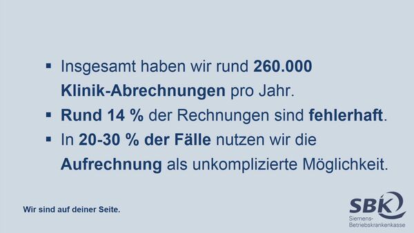 In 20 bis 30 Prozent der Rückforderungen kommt das Krankenhaus unserer Aufforderung nicht nach. Dann rechnen wir unsere Forderung mit neuen, unstrittigen Rechnungen des Krankenhauses auf. Ein in der Wirtschaft alltägliches Verfahren. In nur ca. 200 Fällen jährlich führt die SBK Gerichtsverfahren mit Kliniken in diesem Abrechnungskontext – bei über 260.000 Abrechnungsfällen pro Jahr. Mit dem Aufrechnungsverbot wird uns der unbürokratische Weg der Aufrechnung genommen. Ich gehe davon aus, dass Kliniken fehlerhafte Abrechnungen künftig deutlich später zurückzahlen werden. Von unkooperativen Kliniken wird die SBK den Fehlabrechnungsbetrag über den Weg der Klage erstreiten müssen – auch bei kleineren Beträgen. Das volle Prozessrisiko liegt dabei bei uns als Krankenkasse, auch wenn es ein erhebliches Informationsgefälle zu unseren Ungunsten gibt.