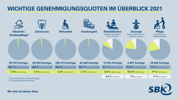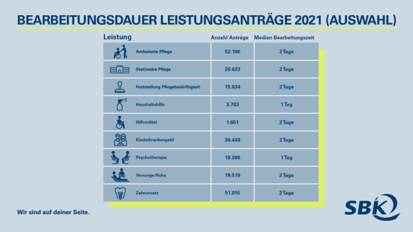 Schon in den vergangenen Jahren hatte die SBK ihre Transparenzinitiative um zusätzliche Kennzahlen, zum Beispiel Genehmigungs- und Ablehnungsquoten von Leistungen erweitert. 2021 lag die Genehmigungsquote in Bereichen wie häusliche Krankenpflege, Zahnersatz oder Hilfsmittel bei knapp unter 100 Prozent, der Median der Bearbeitungsdauer der relevanten Leistungen bei ein bis zwei Tagen. Mit dem vorliegenden Transparenzbericht veröffentlicht die SBK nun zudem Informationen aus für die Versicherten gewichtigen Leistungsbereichen wie Kinderkrankengeld und Psychotherapie.