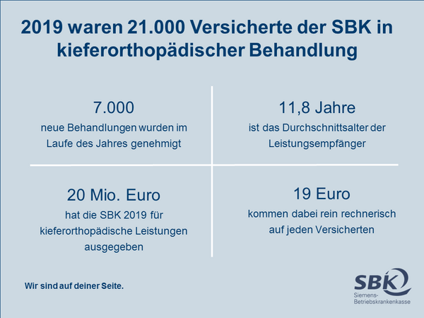 Gesetzliche Krankenkassen erstatten Zahnspangen für Versicherte regulär bis zum Alter von 18 Jahren. Insgesamt gibt die SBK jährlich rund 20 Millionen Euro für kieferorthopädische Leistungen aus. Im Jahr 2019 verzeichnete die Kasse 21.000 laufende Behandlungsfälle. Das Durchschnittalters der Patienten lag dabei bei 11,8 Jahren.