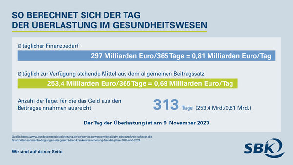Der Tag der Überlastung im Gesundheitswesen markiert das Datum, an dem die Einnahmen der gesetzlichen Krankenkassen aus dem allgemeinen Beitragssatz erschöpft sind. Um dieses Datum zu berechnen, werden die für 2023 geschätzten Einnahmen (Stand 12.10.23) aus dem allgemeinen Beitragssatz (253,4 Mrd.) den für 2023 erwarteten Ausgaben der GKV (297 Mrd.) gegenübergestellt.