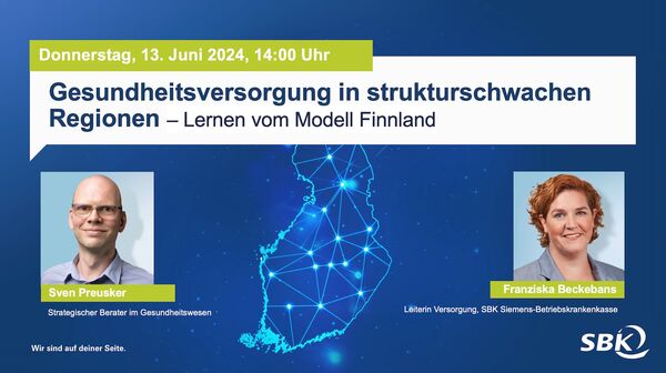 Konkrete Lösungsansätze zu diesen drängenden Fragen stellen wir Ihnen mit unserem neuen Whitepaper „Finnland: Gesundheitsversorgung in der Fläche“ vor. Finnland-Experte Sven Preusker zeigt auf, was wir von dem Vorbild im hohen Norden lernen können. Franziska Beckebans, Bereichsleiterin für Versorgung der SBK Siemens-Betriebskrankenkasse, erklärt, wie die elektronische Patientenakte zum Gamechanger in strukturschwachen Regionen werden kann.