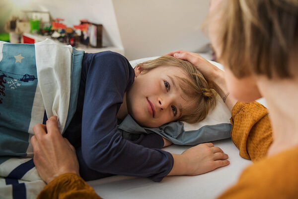 Eine Mutter deckt ihren Sohn zum Einschlafen zu.