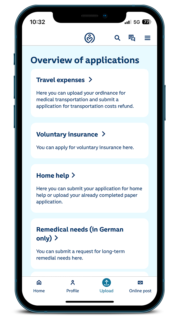 You receive the medically necessary travel costs to your treatments - by ambulance, cab or public transport. You can upload your prescription for medical transportation in Meine SBK to apply for reimbursement. You can find detailed information